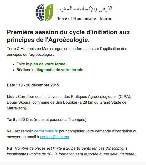 Lieu : Carrefour des Initiatives et des Pratiques Agro-écologiques (CIPA), Douar Skoura, Commune de Sidi Boubker (à 28 km du Grand Stade de Marrakech).